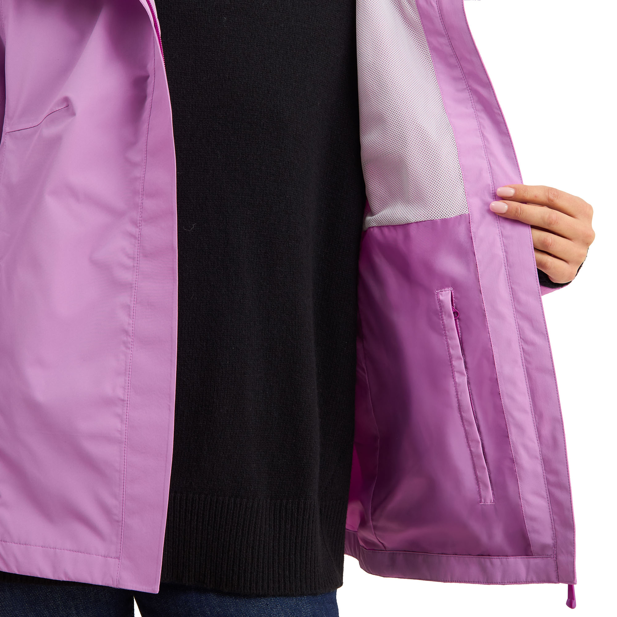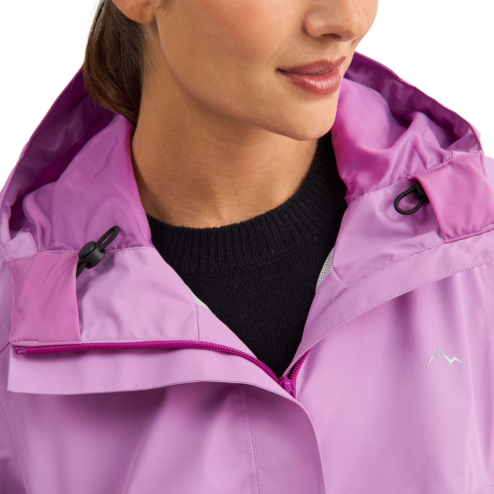 • ​Waterproof • ​Taped seams • ​Wind resistant​ ​• ​Breathable • ​Packable into its own pocket ​• ​Made with Atmodry® technology • ​Made from 50% recycled materials • ​F​ixed hood with raincap to prevent raindrops from dripping on face • ​Hidden adjustable bungee cord at hood for a customized fit • ​Front placket to protect body from the rain and wind • ​Storm placket underneath center front zipper closure to stop wind from cutting through • ​Hidden zipper side pockets to safely store your accessories • ​Adjustable velcro sleeve tab at cuffs for a customized fit • ​Reflective logo branded detail at chest and back • ​Back flap for raindrops to drip away from body • ​Upper mesh lining for additional breathability • ​Interior welt zipper pocket for additional storage • ​Colour(s) Black, Pink • ​Made in Vietnam